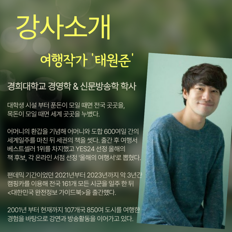 □ 강 사: 태원준 (인문학 강의 ‘여행작가’)