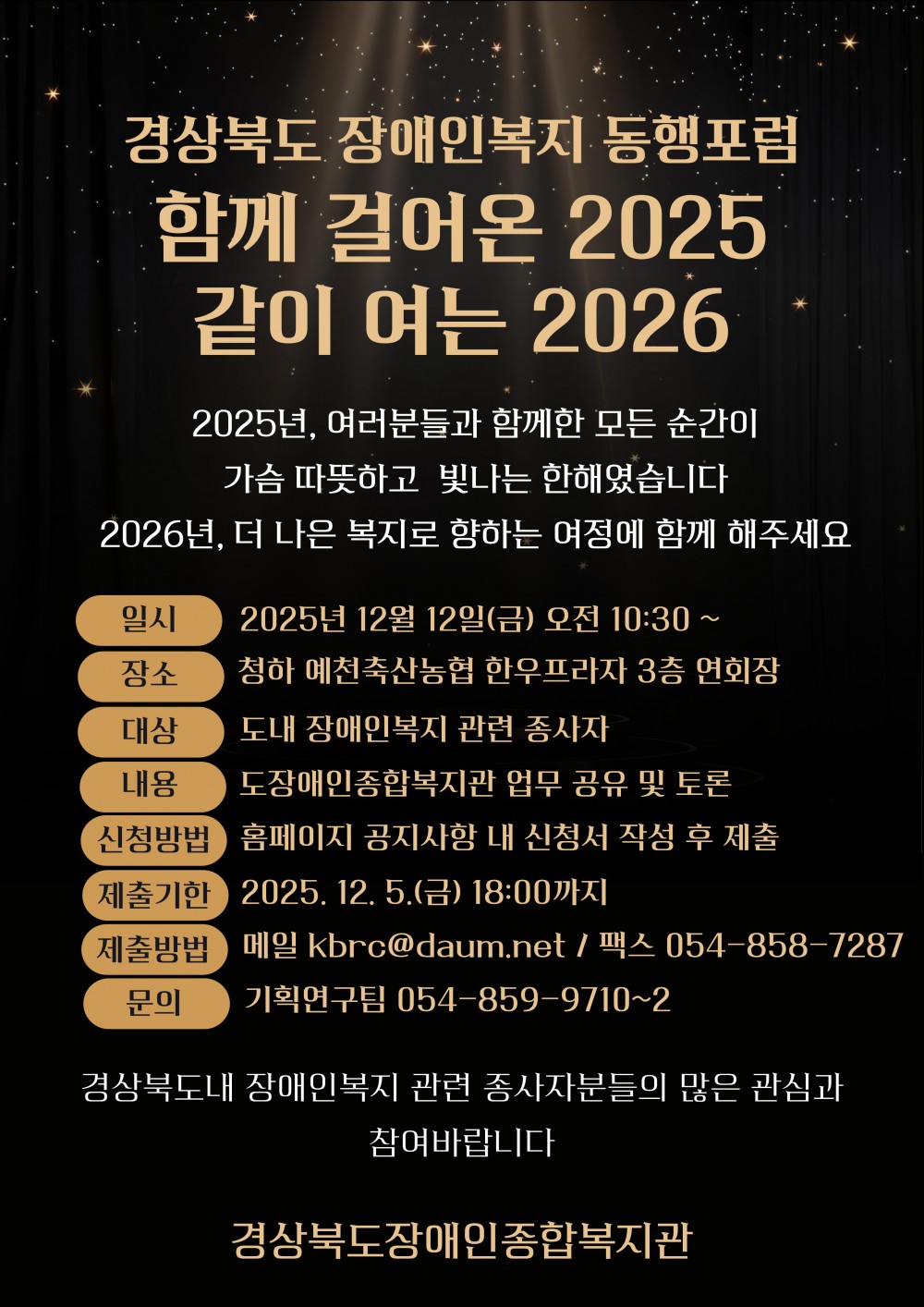 경상북도 장애인복지 동행포럼 개최 안내 관리자 경상북도장애인종합복지관 0 60 11.20 10:26 http://www.gbrc.or.kr/gbrc/bbs/board.php?bo_table=bo_01&wr_id=3332 + 25 2025.11.20 10:30 경상북도 장애인복지 동행포럼 함께 걸어온 2025 같이 여는 2026 개최 계획안.hwp (1.3M) + 1 2025.11.20 10:30 참가 신청서.hwp (112.0K) + 1 경상북도장애인종합복지관은 도내 장애인관련 기관과의 네트워크 형성을 통한 도복지관 사업 협력 및 추진을 위해 경상북도 장애인복지 동행포럼 "함께 걸어온 2025, 같이 여는 2026"를 개최하오니 많은 참석 바랍니다. 주요 내용: 경상북도장애인종합복지관 25년 성과 및 26년 주요사업 안내와 신규사업에 대한 사업제안 청취 및 질의 응답