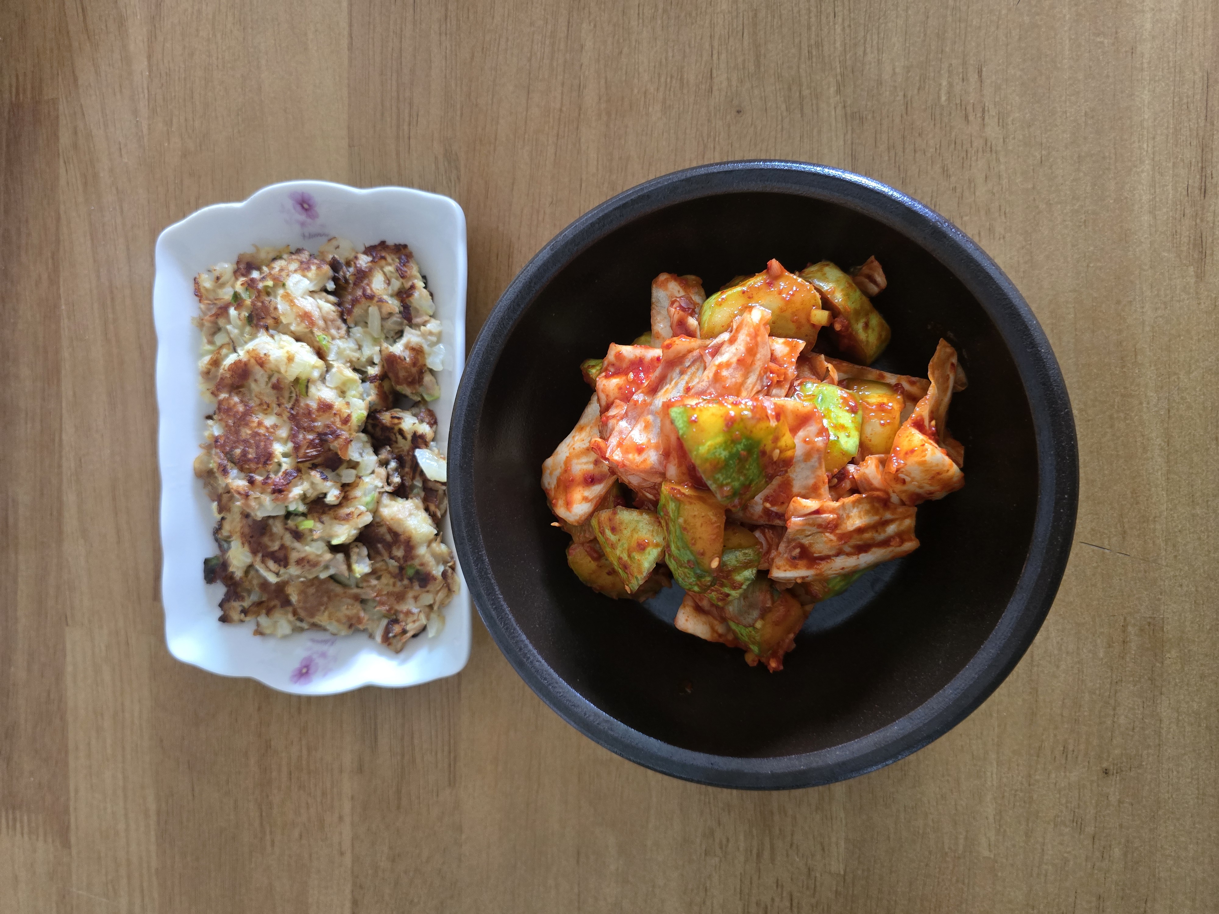 고소한 참치전 한 입과 상큼한 오이양배추 무침을 함께 먹으면 정말 맛있을 것 같아요.