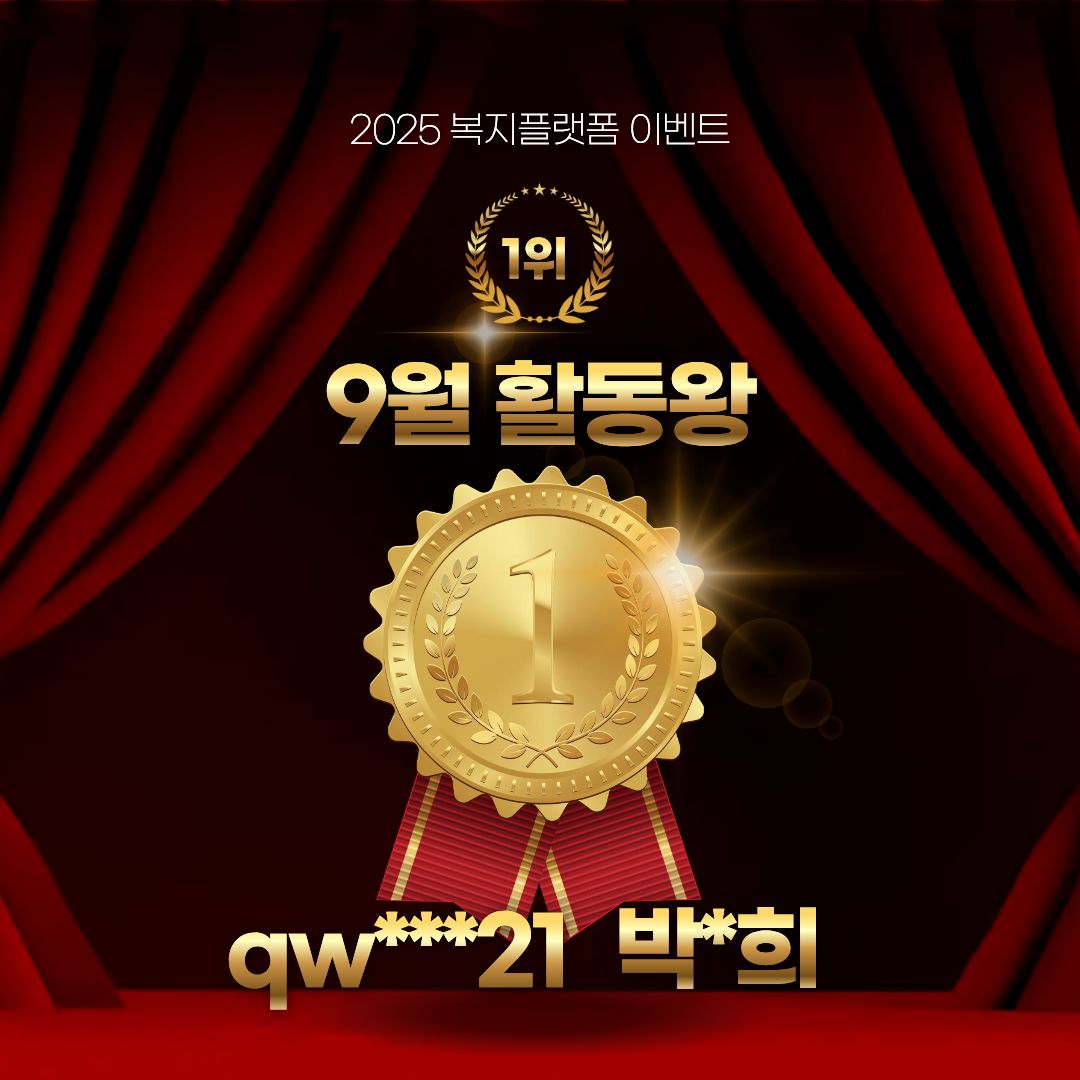 9월 활동왕, 후기왕 발표합니다! 관리자 당첨자 발표 0 31 10.14 14:08 안녕하세요? 경북장애인복지플랫폼입니다.9월 활동왕, 후기왕 선정자 발표합니다.모두 축하드립니다!한 달 동안 열심히 활동해주셔서 감사드리고,활동왕과 후기왕 이벤트는 11월까지 매달 진행하니 계속해서 많은 관심과 참여 부탁드립니다.!!아울러 홍보왕 이벤트도 11월까지 계속되니 모두들 도전해보세요!! (조금만 참여하셔도 당첨율이 아주 높습니다!)감사합니다^^.