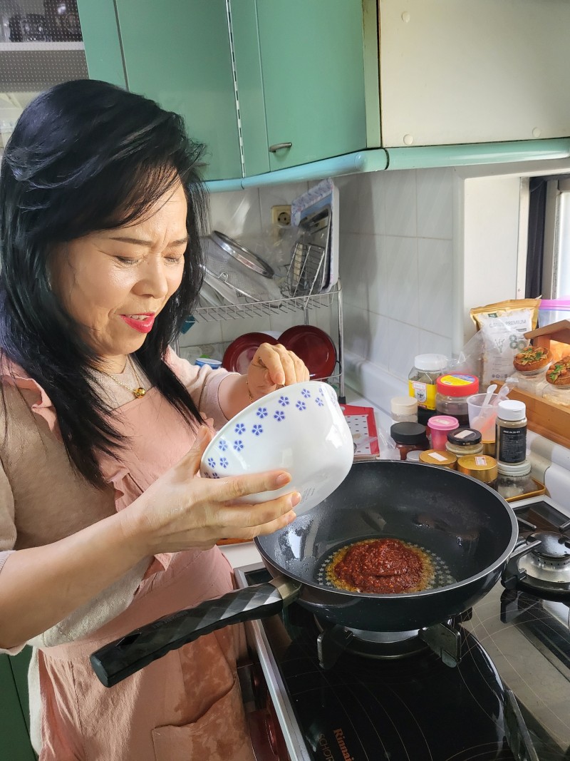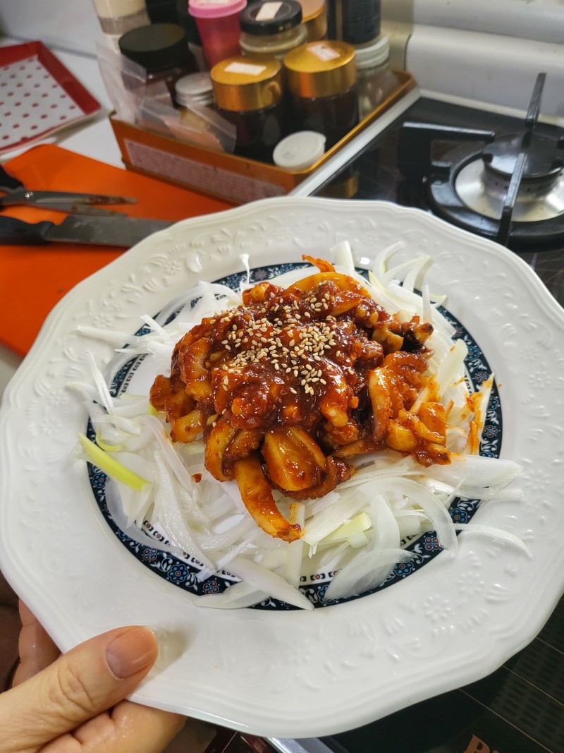 양념장 만들어 후라이팬에 볶아 불향을 내고 재빨리 쭈꾸미 와 갑오징를 볶아 참기름을 넣고 완성했습니다