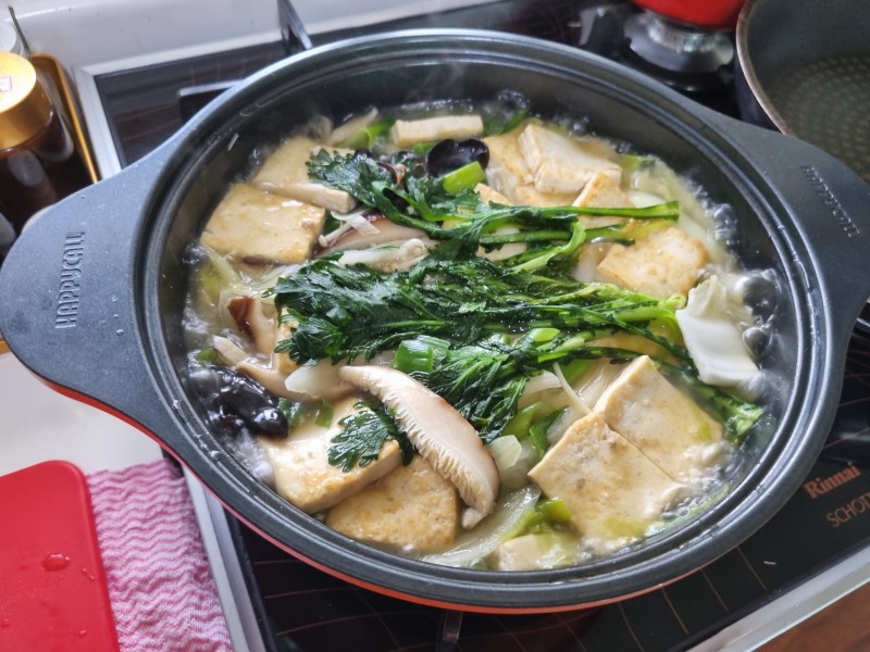 전골 냄비에 야채랑 세가지 버섯과 두부를 보기좋게 넣고 중간에 양념한 소고기를 올리고 선생님께서 만들어주신 육수와 맛간장에 물 한컵을 넣어 간을 보고 저는 소금을 조금 더넣고 재료위에 부어주고 끓였습니다