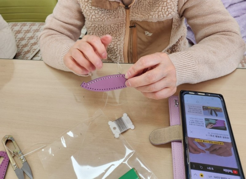 스마트홈케어 공예활동-가죽공예 키링만들기 설화 1 2244 2024.03.14 14:07 처음 접하는 거라 동영상 보고 따라하려니 조금 어려웠습니다. 하지만, 완성되어가는 것을 보니 성취감이 들었어요. 하지만, 실의 양이 조금 아쉬웠다는 점. 초보자인 저로서는 처음 바느질을 실패하여 실을 많이 사용했거든요. 실이 모자랄까 노심초사...ㅠㅠ 이러쿵 저러쿵 해도 즐거운 시간이었습니다. 핸드폰에 걸었는데 셋트 같이 찰떡 같더군요. 너무 예뻐요. 다음 시간이 기대가 되네요